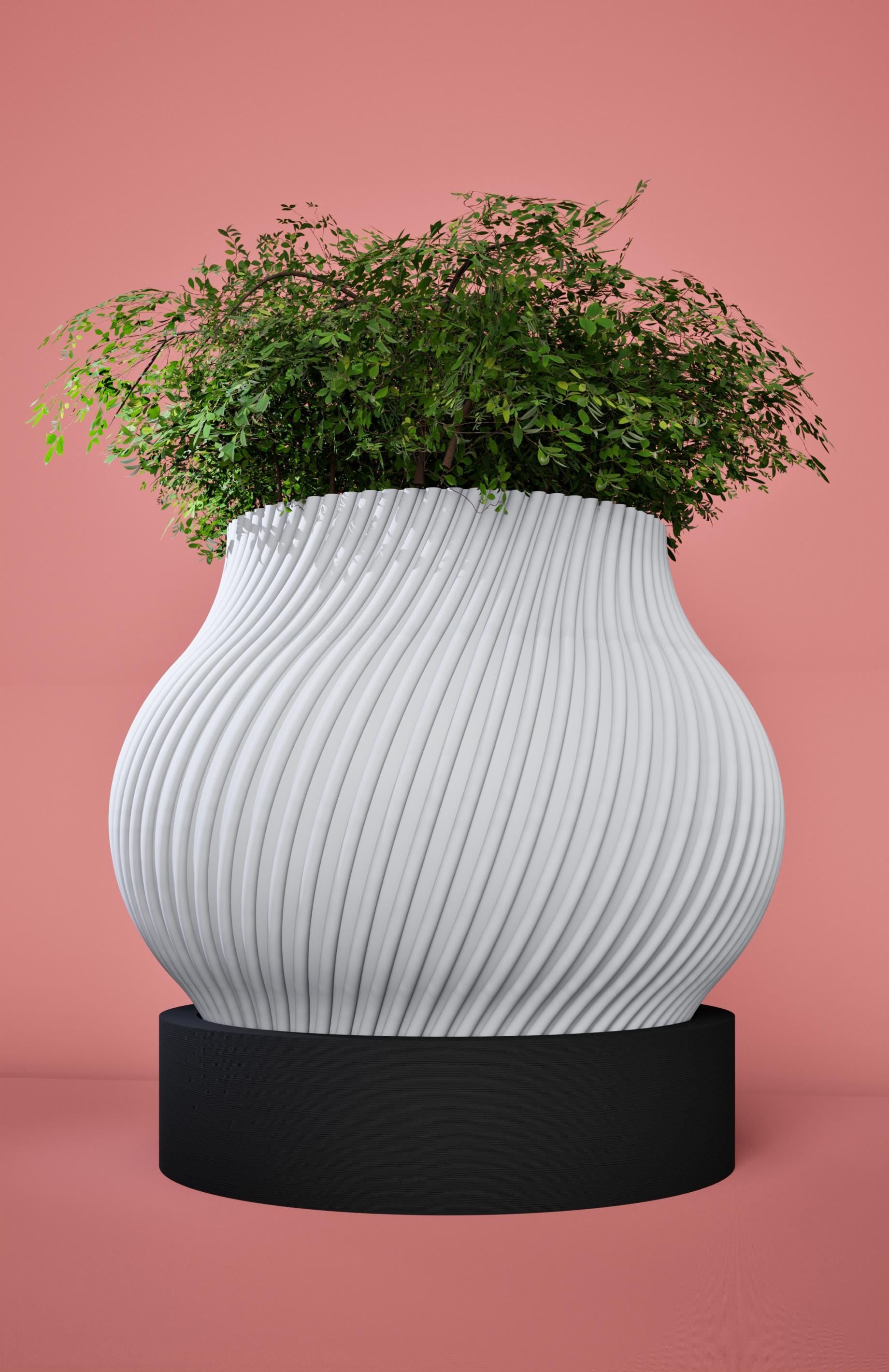 A white 3d printed vase inspired by clay pottery, printed with a black base.